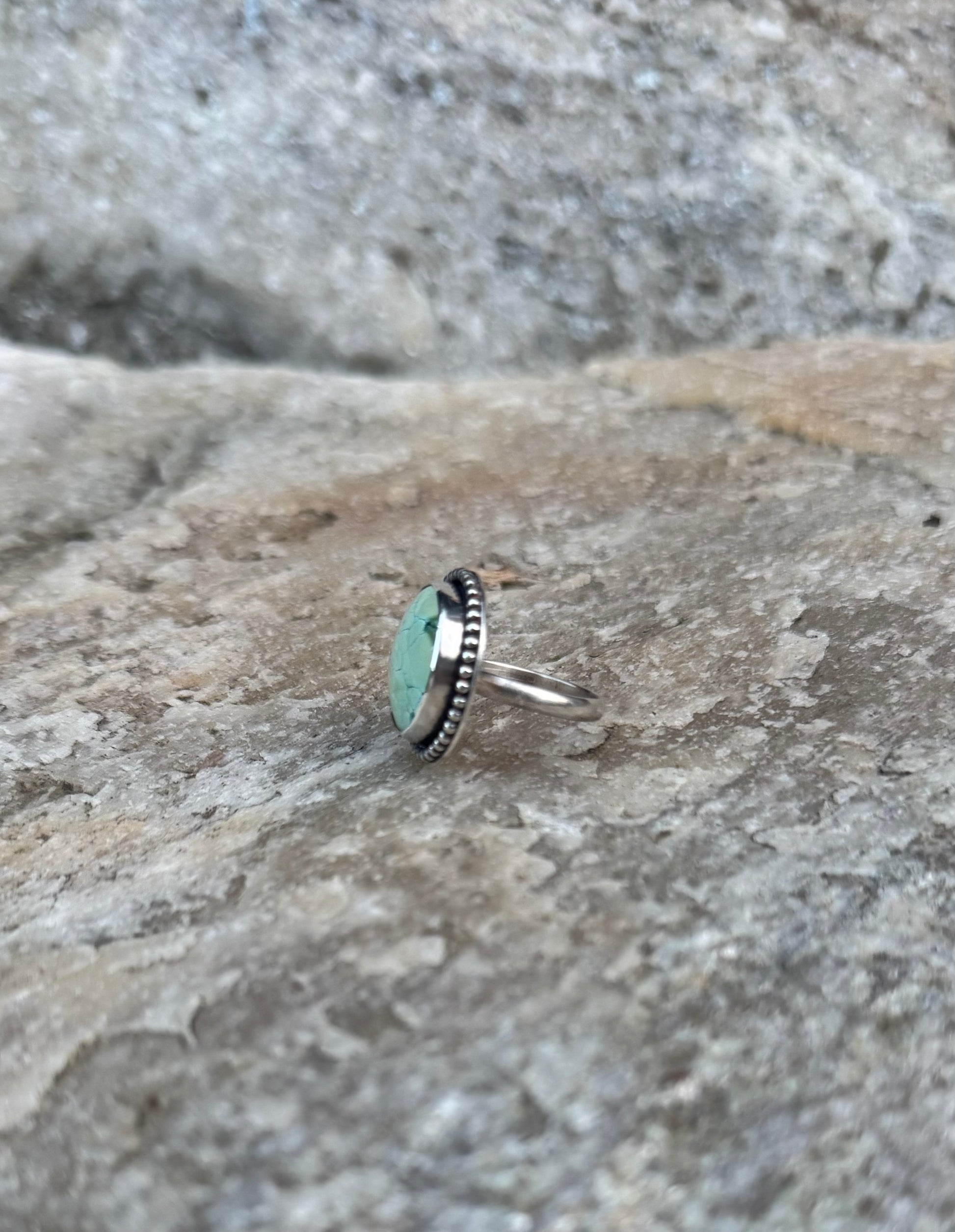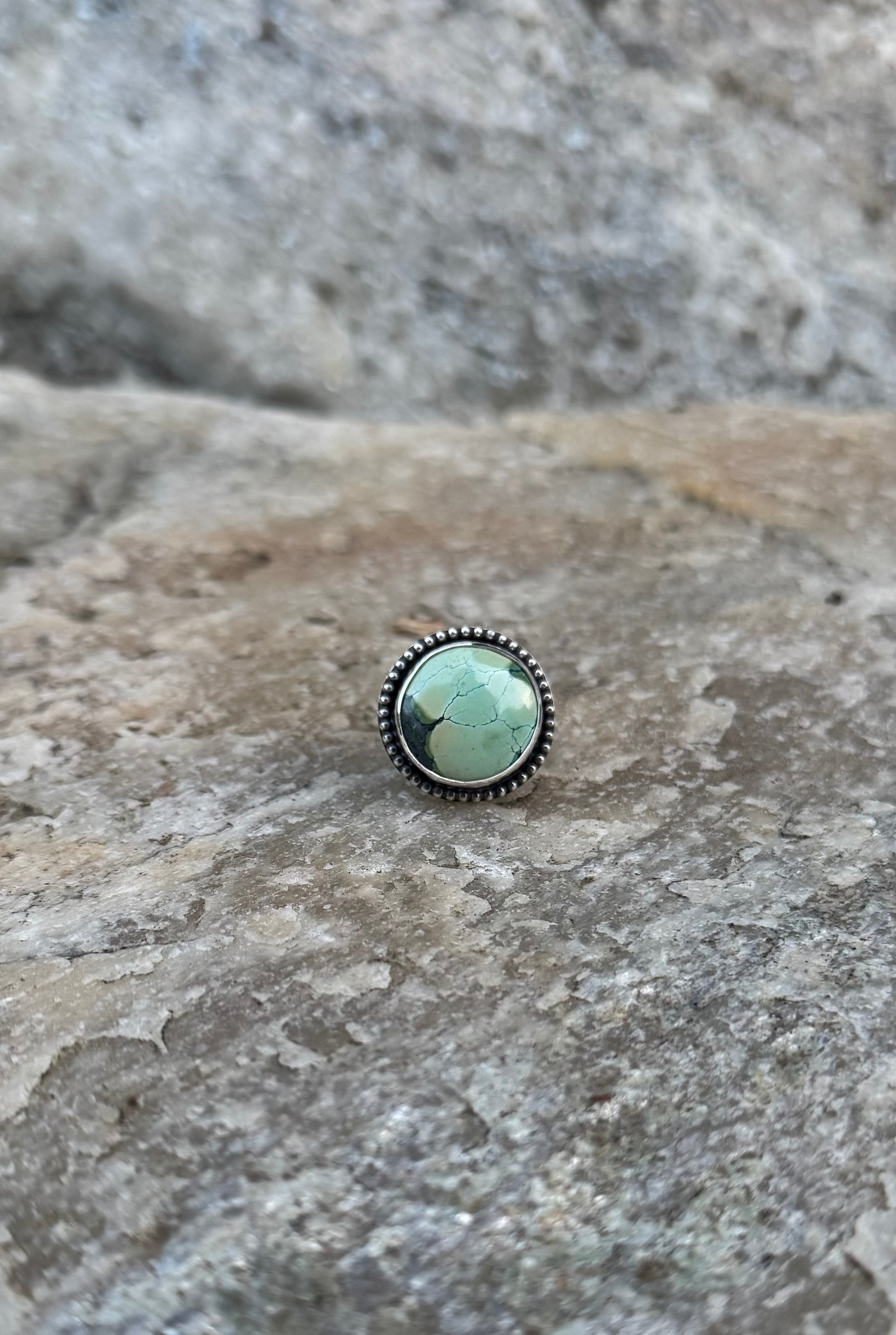 Sterling silver ring with medium, round hubei turquoise stone and beaded border.
